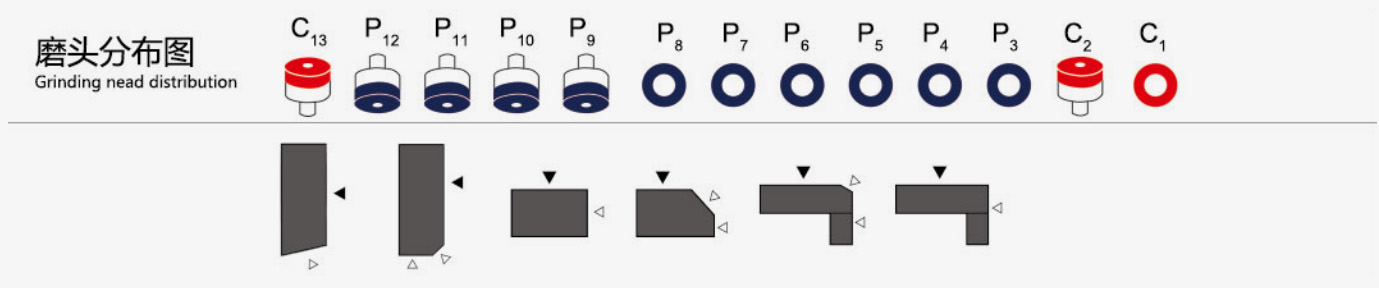 該系列全部機型采用數控配置PLC面闆,無極調速,工作台滾輪輔助上料,履帶式橡膠夾傳送石材,有手動和自動兩種操作模式,磨輪可在運行過程中自動補償。可磨削加工不同尺寸、厚度的石材,能一次性完成粗磨、精磨和抛光,主要用于加工上下R圓+定厚+側抛、大斜邊+側抛+正面R圓、馬肚邊+上下R圓線形,加工後亮度高于闆面亮度,在磨削過程中可調節進料速度和進行量,最大加工速度可達5M/分鍾。該機精準度高、效率快、操作維護簡單方便,并杜絕出現人工加工時産生的工藝缺陷。
