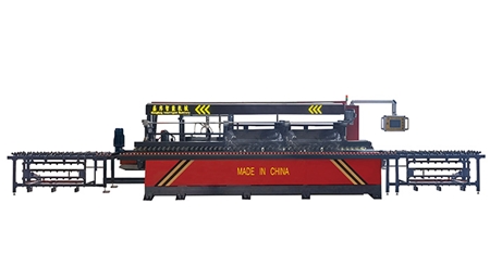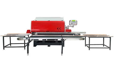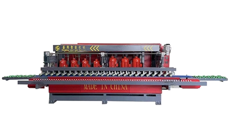 該機器采用數控,變頻調速,帶記憶功能,連續加工時可左右設置留口,可選擇連續進料或間隔進料加工,配置新款輸送架安裝防水防塵萬向輪,帶回闆連線功能,可實現加工闆材多邊不落地,抛光磨料配置内出水